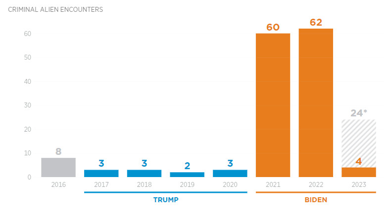 According to 2022 and 2023 data compiled and released by The Heritage Foundation, in relation to annual convicted criminal alien encounters by US Border Patrol, homicide and manslaughter encounters have increased 1966% since Trump’s last year in office (2020). The recorded count during Trump’s last year in office was 3. The recorded count during Biden’s current year in office is 62.