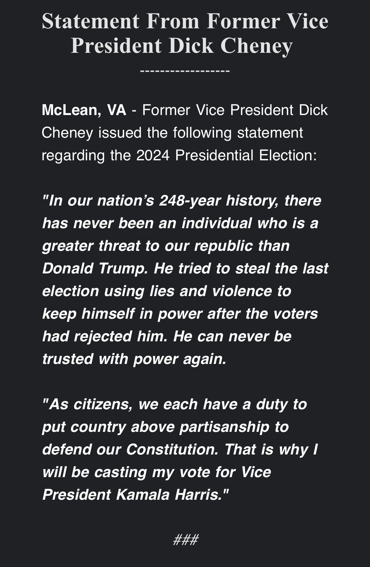 Kamala Harris, during the 2024 election cycle has been endorsed by Vladimir Putin, The IRS Union, and Dick Cheney.