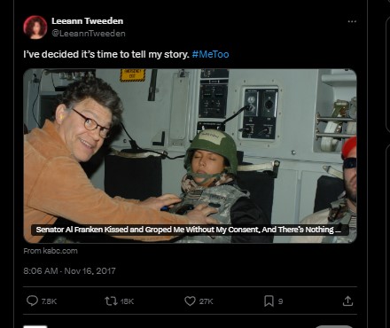 On November 16, 2017, Leeann Tweeden alleged that Al Franken engaged in sexual misconduct towards her. In 2006, Al Franken was photographed holding his hands above her breasts, as she was sleeping while wearing both body armor and a helmet. On December 7, 2017, Al Franken resigned from the Senate.